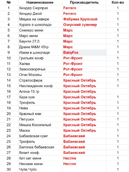 Вес: 600 гр.Состав: Киндер Сюрприз-1 шт, Киндер Джой-1 шт, Мишка на севере-1 шт, Курага в шоколаде-1 шт, Сникерс мини-1 шт, Марс мини-1 шт, Баунти 27,5-1 шт, Драже M&M 45гр-1 шт, Изюм в шоколаде РФ-1 шт, Грильяж конф-1 шт, Халва-1 шт, Замоскворечье-1 шт, Огни Москвы-1 шт, Стратосфера-1 шт, Наслаждение конф-1 шт, Алека 15 гр-1 шт, Кара кум-1 шт, Трюфель-1 шт, Нива-1 шт, Красный мак-1 шт, Петушок-1 шт, Мишка Косолапый-1 шт, Маска-1 шт, Бабаевская ориг-1 шт, Трюфель-1 шт, Белочка бабаевская-1 шт, Визит конф.-1 шт, Кит кат мини-1 шт, Несквик мини-1 шт, Леденец на палочке - 1шт