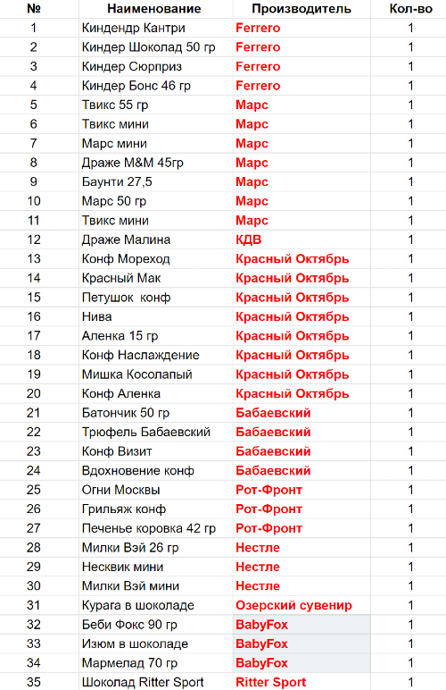 Вес: 1200 гр.Состав:Киндер Кантри-1 шт, Киндер Шоколад 50 гр-1 шт, Киндер Сюрприз-1 шт, Киндер Бонс 46 гр-1 шт, Твикс 55 гр-1 шт, Твикс мини-2 шт, Марс мини-1 шт, Драже M&M 45гр-1 шт, Баунти 27,5-1 шт, Марс 50 гр-1 шт, Драже Малина-1 шт, Конф Мореход-1 шт, Красный Мак-1 шт, Петушок конф-1 шт, Нива-1 шт, Аленка 15 гр-1 шт, Конф Наслаждение-1 шт, Мишка Косолапый-1 шт, Конф Аленка-1 шт, Батончик 50 гр-1 шт, Трюфель Бабаевский-1 шт, Конф Визит-1 шт, Вдохновение конф-1 шт, Огни Москвы-1 шт, Грильяж конф-1 шт, Печенье коровка 42 гр-1 шт, Милки Вэй 26 гр-1 шт, Несквик мини-1 шт, Милки Вэй мини-1 шт, Курага в шоколаде-1 шт, Беби Фокс 90 гр-1 шт, Изюм в шоколаде РФ-1 шт, Мармелад 70 гр-1 шт, Шоколад Ritter Sport-1 шт