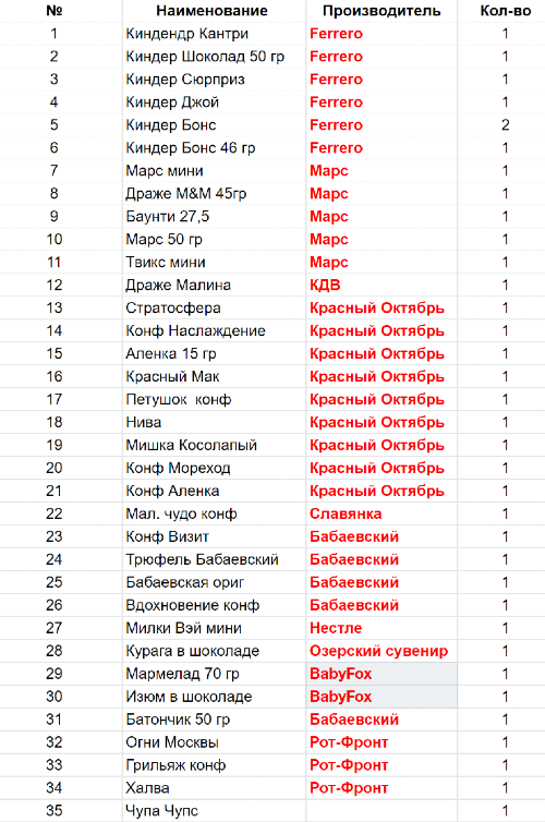 Вес: 950 гр.Состав: Киндер Кантри-1 шт, Киндер Шоколад 50 гр-1 шт, Киндер Сюрприз-1 шт, Киндер Джой-1 шт, Киндер Бонс-2 шт, Киндер Бонс 46 гр-1 шт, Марс мини-1 шт, Драже M&M 45гр-1 шт, Баунти 27,5-1 шт, Марс 50 гр-1 шт, Твикс мини-1 шт, Драже Малина-1 шт, Стратосфера-1 шт, Конф Наслаждение-1 шт, Аленка 15 гр-1 шт, Красный Мак-1 шт, Петушок конф-1 шт, Нива-1 шт, Мишка Косолапый-1 шт, Конф Мореход-1 шт, Конф Аленка-1 шт, Мал. чудо конф-1 шт, Конф Визит-1 шт, Трюфель Бабаевский-1 шт, Бабаевская ориг-1 шт, Вдохновение конф-1 шт, Милки Вэй мини-1 шт, Курага в шоколаде-1 шт, Мармелад 70 гр-1 шт, Изюм в шоколаде РФ-1 шт, Батончик 50 гр-1 шт, Огни Москвы-1 шт, Грильяж конф-1 шт, Халва-1 шт, Леденец на палочке