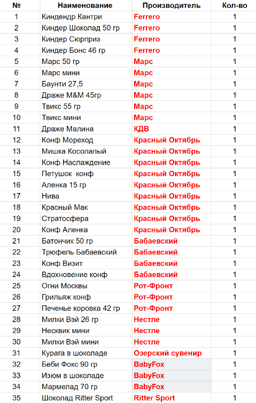Вес: 1200 гр.Состав:Киндер Кантри-1 шт, Киндер Шоколад 50 гр-1 шт, Киндер Сюрприз-1 шт, Киндер Бонс 46 гр-1 шт, Марс 50 гр-1 шт, Марс мини-1 шт, Баунти 27,5-1 шт, Драже M&M 45гр-1 шт, Твикс 55 гр-1 шт, Твикс мини-1 шт, Драже Малина-1 шт, Конф Мореход-1 шт, Мишка Косолапый-1 шт, Конф Наслаждение-1 шт, Петушок конф-1 шт, Аленка 15 гр-1 шт, Нива-1 шт, Красный Мак-1 шт, Стратосфера-1 шт, Конф Аленка-1 шт, Батончик 50 гр-1 шт, Трюфель Бабаевский-1 шт, Конф Визит-1 шт, Вдохновение конф-1 шт, Огни Москвы-1 шт, Грильяж конф-1 шт, Печенье коровка 42 гр-1 шт, Милки Вэй 26 гр-1 шт, Несквик мини-1 шт, Милки Вэй мини-1 шт, Курага в шоколаде-1 шт, Беби Фокс 90 гр-1 шт, Изюм в шоколаде РФ-1 шт, Мармелад 70 гр-1 шт, Шоколад Ritter Sport-1 шт