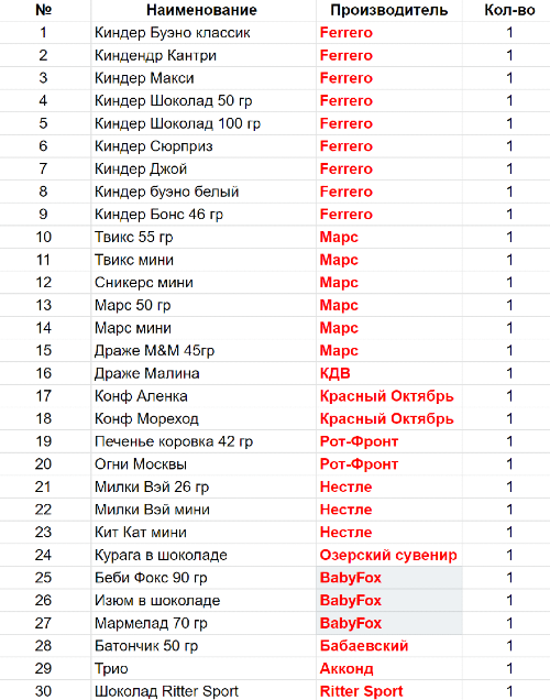 Вес: 1300 гр.Состав:Киндер Шоколад 100 гр 1шт, Киндер Сюрприз 1шт, Киндер Джой 1шт, Киндер буэно белый 1шт, Киндер Бонс 46 гр 1шт, Твикс 55 гр 1шт, Твикс мини 1шт, Сникерс мини 1шт, Марс 50 гр 1шт, Марс мини 1шт, Драже M&M 45гр 1шт, Драже Малина 1шт, Конф Аленка 1шт, Конф Мореход 1шт, Печенье коровка 42 гр 1шт, Огни Москвы 1шт, Милки Вэй 26 гр 1шт, Милки Вэй мини 1шт, Кит Кат мини 1шт, Курага в шоколаде 1шт, Беби Фокс 90 гр 1шт, Изюм в шоколаде 1шт, Мармелад 70 гр 1шт, Батончик 50 гр 1шт, Трио 1шт, Шоколад Ritter Sport 1шт