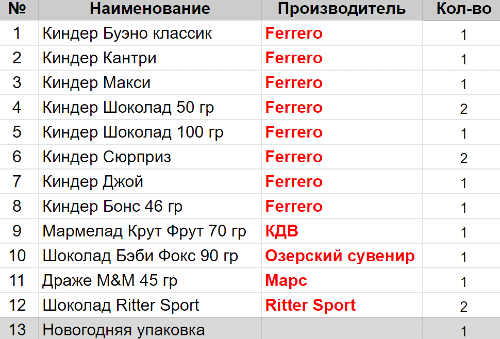 Вес: 902 гр.Состав: Буэно классик 1 шт, Кантри 1 шт, Макси 1 шт, Шоколад 50 гр 2 шт, Шоколад 100 гр 1 шт, Сюрприз 2 шт, Джой 1 шт, Бонс 46 гр 1 шт, Мармелад Крут Фрут 70гр 1 шт, Беби Фокс 90гр 1 шт, Драже M&M 45гр 1 шт, Шоколад Ritter Sport 2 шт