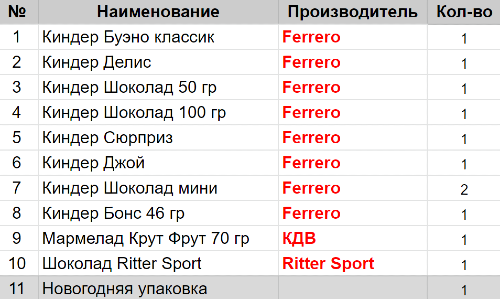 Вес: 555 гр.Состав: Буэно классик 1 шт, Делис 1 шт, Шоколад 50 гр 1 шт, Шоколад 100 гр 1 шт, Сюрприз 1 шт, Джой 1 шт, Шоколад мини 2 шт, Бонс 46 гр 1 шт, Мармелад Крут Фрут 70гр 1 шт, Шоколад Ritter Sport 1 шт