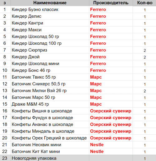Вес: 818 гр.Состав: Буэно классик 1 шт, Делис 1 шт, Кантри 1 шт, Макси 1 шт, Шоколад 50 гр 1 шт, Шоколад 100 гр 1 шт, Сюрприз 2 шт, Джой 2 шт, Шоколад мини 1 шт, Бонс 46 гр 1 шт, Твикс 55гр 1 шт, Сникерс 50,5гр 1 шт, Милки Вэй 26гр 2 шт, Вишня в шоколаде 1 шт, Фундук в шоколаде 1 шт, Ананас в шоколаде 1 шт, Миндаль в шоколаде 1 шт, Марс 50гр 1 шт, Несквик мини 1 шт, Драж