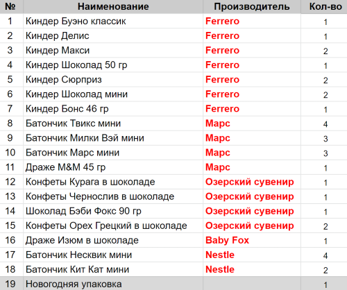 Вес: 820 гр.Состав: Буэно классик 1 шт, Делис 1 шт, Макси 2 шт, Шоколад 50 гр 1 шт, Сюрприз 2 шт, Шоколад мини 2 шт, Бонс 46 гр 1 шт, Твикс мини 4 шт, Милки Вэй мини 3 шт, Курага в шоколаде 1 шт, Чернослив в шоколаде 1 шт, Марс мини 3 шт, Несквик мини 4 шт, Беби Фокс 90гр 1 шт, Драже M&M 45гр 1 шт, Изюм в шоколаде 1 шт, Кит Кат мини 2 шт, Орех грецкий в шоколаде 2 шт