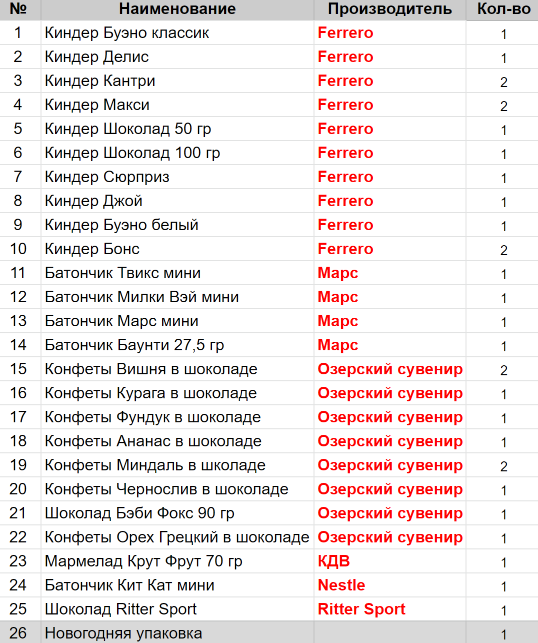 Вес: 951 гр.Состав: Буэно классик 1 шт, Делис 1 шт, Кантри 2 шт, Макси 2 шт, Шоколад 50 гр 1 шт, Шоколад 100 гр 1 шт, Сюрприз 1 шт, Джой 1 шт, Буэно белый 1 шт, Бонс 2 шт, Твикс мини 1 шт, Милки Вэй мини 1 шт, Вишня в шоколаде 2 шт, Курага в шоколаде 1 шт, Фундук в шоколаде 1 шт, Ананас в шоколаде 1 шт, Миндаль в шоколаде 2 шт, Чернослив в шоколаде 1 шт, Марс мини 1 шт, Ма