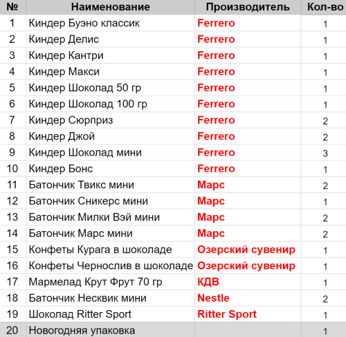 Вес: 855 гр.Состав: Буэно классик 1 шт, Делис 1 шт, Кантри 1 шт, Макси 1 шт, Шоколад 50 гр 1 шт, Шоколад 100 гр 1 шт, Сюрприз 2 шт, Джой 2 шт, Шоколад мини 3 шт, Бонс 46 гр 1 шт, Твикс мини 2 шт, Сникерс мини 1 шт, Милки Вэй мини 2 шт, Курага в шоколаде 1 шт, Чернослив в шоколаде 1 шт, Марс мини 2 шт, Мармелад Крут Фрут 70гр 1 шт, Несквик мини 2 шт, Шоколад Ritter Sport