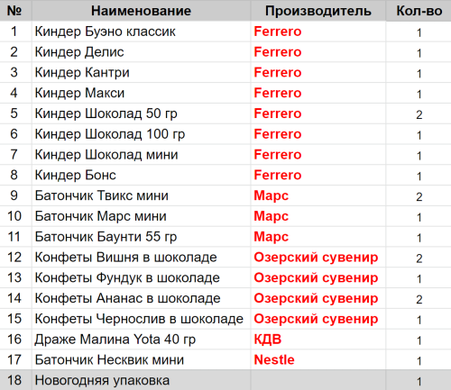 Вес: 611 гр.Состав: Буэно классик 1 шт, Делис 1 шт, Кантри 1 шт, Макси 1 шт, Шоколад 50 гр 2 шт, Шоколад 100 гр 1 шт, Шоколад мини 1 шт, Бонс 1 шт, Твикс мини 2 шт, Вишня в шоколаде 2 шт, Фундук в шоколаде 1 шт, Ананас в шоколаде 2 шт, Чернослив в шоколаде 1 шт, Малина Yota 40гр 1 шт, Марс мини 1 шт, Несквик мини 1 шт, Баунти 55 гр 1 шт