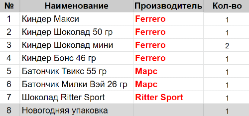 Вес: 329 гр.Состав: Макси 1 шт, Шоколад 50 гр 1 шт, Шоколад мини 2 шт, Бонс 46 гр 1 шт, Твикс 55гр 1 шт, Милки Вэй 26гр 1 шт, Шоколад Ritter Sport 1 шт