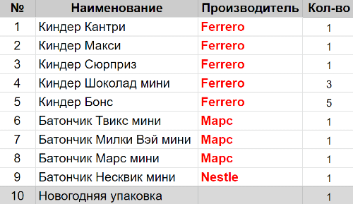 Вес: 180 гр.Состав: Кантри 1 шт, Макси 1 шт, Сюрприз 1 шт, Шоколад мини 3 шт, Бонс 5 шт, Твикс мини 1 шт, Милки Вэй мини 1 шт, Марс мини 1 шт, Несквик мини 1 шт