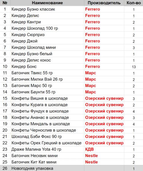 Вес: 1237 гр.Состав: Буэно классик 1 шт, Делис 1 шт, Кантри 2 шт, Шоколад 100 гр 1 шт, Сюрприз 2 шт, Джой 2 шт, Шоколад мини 3 шт, Буэно белый 1шт, Делис кокос 1 шт, Бонс 13 шт, Твикс 55гр 1 шт, Милки Вэй 26гр 2 шт, Вишня в шоколаде 3 шт, Курага в шоколаде 2 шт, Фундук в шоколаде 4 шт, Ананас в шоколаде 3 шт, Миндаль в шоколаде 4 шт, Чернослив в шоколаде 1 шт, Марс 50гр