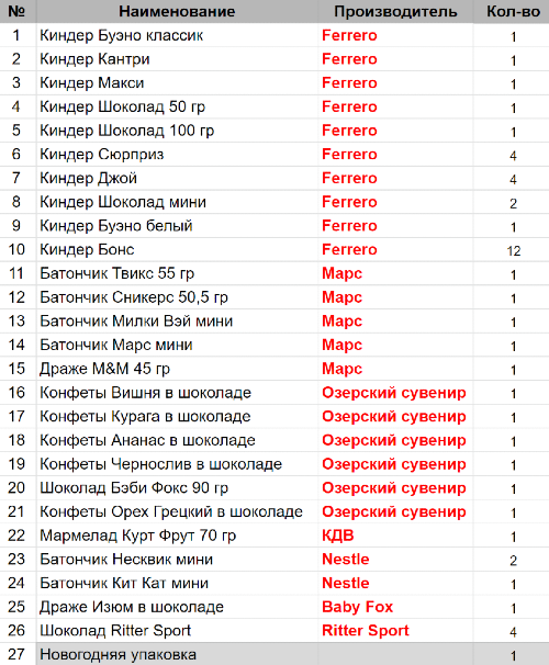 Вес: 1622 гр.Состав: Буэно классик 1 шт, Кантри 1 шт, Макси 1 шт, Шоколад 50 гр 1 шт, Шоколад 100 гр 1 шт, Сюрприз 4 шт, Джой 4 шт, Шоколад мини 2 шт, Буэно белый 1шт, Бонс 12 шт, Твикс 55гр 1 шт, Сникерс 50,5гр 1 шт, Милки Вэй мини 1 шт, Вишня в шоколаде 1 шт, Курага в шоколаде 1 шт, Ананас в шоколаде 1 шт, Чернослив в шоколаде 1 шт, Марс мини 1 шт, Мармелад Крут Фрут 7