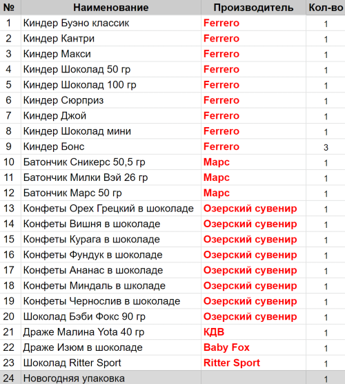 Вес: 968 гр.Состав: Буэно классик 1 шт, Кантри 1 шт, Макси 1 шт, Шоколад 50 гр 1 шт, Шоколад 100 гр 1 шт, Сюрприз 1 шт, Джой 1 шт, Шоколад мини 1 шт, Бонс 3 шт, Сникерс 50,5гр 1 шт, Милки Вэй 26гр 1 шт, Вишня в шоколаде 1 шт, Курага в шоколаде 1 шт, Фундук в шоколаде 1 шт, Ананас в шоколаде 1 шт, Миндаль в шоколаде 1 шт, Чернослив в шоколаде 1 шт, Марс 50гр 1 шт, Малина Yo