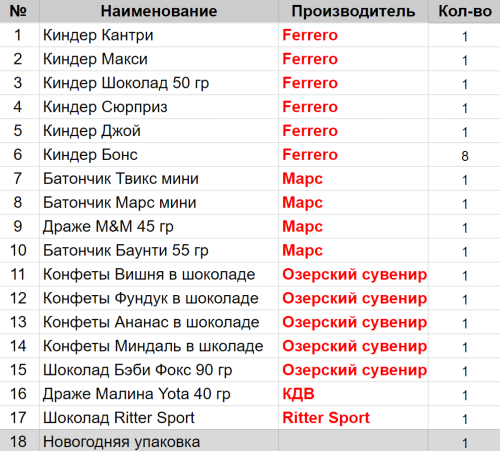 Вес: 657 гр.Состав: Кантри 1 шт, Макси 1 шт, Шоколад 50 гр 1 шт, Сюрприз 1 шт, Джой 1 шт, Бонс 8 шт, Твикс мини 1 шт, Вишня в шоколаде 1 шт, Фундук в шоколаде 1 шт, Ананас в шоколаде 1 шт, Миндаль в шоколаде 1 шт, Малина Yota 40гр 1 шт, Марс мини 1 шт, Беби Фокс 90гр 1 шт, Драже M&M 45гр 1 шт, Баунти 55 гр 1 шт, Шоколад Ritter Sport 1 шт