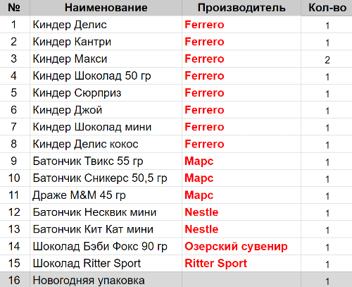 Вес: 713 гр.Состав: Делис 1 шт, Кантри 1 шт, Макси 2 шт, Шоколад 50 гр 1 шт, Сюрприз 1 шт, Джой 1 шт, Шоколад мини 1 шт, Делис кокос 1 шт, Твикс 55гр 1 шт, Сникерс 50,5гр 1 шт, Несквик мини 1 шт, Беби Фокс 90гр 1 шт, Драже M&M 45гр 1 шт, Кит Кат мини 1 шт, Шоколад Ritter Sport 1 шт