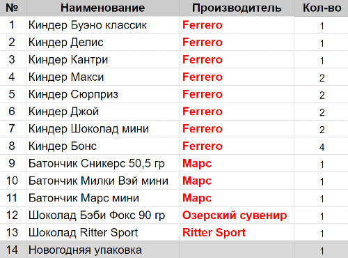 Вес: 664 гр.Состав: Буэно классик 1 шт, Делис 1 шт, Кантри 1 шт, Макси 2 шт, Сюрприз 2 шт, Джой 2 шт, Шоколад мини 2 шт, Бонс 4 шт, Сникерс 50,5гр 1 шт, Милки Вэй мини 1 шт, Марс мини1 шт, Беби Фокс 90гр 1 шт, Шоколад Ritter Sport 1 шт