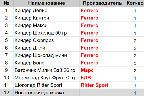 Вес: 545 гр.Состав: Делис 1 шт, Кантри 1 шт, Макси 1 шт, Шоколад 50 гр 1 шт, Сюрприз 2 шт, Джой 2 шт, Шоколад мини 2 шт, Бонс 5 шт, Милки Вэй 26гр 2 шт, Мармелад Крут Фрут 70гр 1 шт, Шоколад Ritter Sport 1 шт