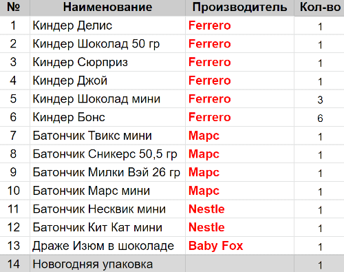 Вес: 434 гр.Состав: Делис 1 шт, Шоколад 50 гр 1 шт, Сюрприз 1 шт, Джой 1 шт, Шоколад мини 3 шт, Бонс 6 шт, Твикс мини 1 шт, Сникерс 50,5гр 1 шт, Милки Вэй 26гр 1 шт, Марс мини1 шт, Несквик мини 1 шт, Изюм в шоколаде 1 шт, Кит Кат мини 1 шт