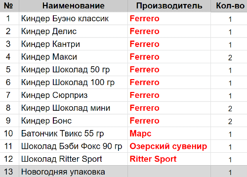 Вес: 652 гр.Состав: Буэно классик 1 шт, Делис 1 шт, Кантри 1 шт, Макси 2 шт, Шоколад 50 гр 1 шт, Шоколад 100 гр 1 шт, Сюрприз 1 шт, Шоколад мини 2 шт, Бонс 2 шт, Твикс 55гр 1 шт, Беби Фокс 90гр 1 шт, Шоколад Ritter Sport 1 шт