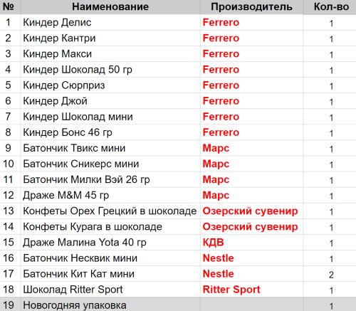 Вес: 596 гр.Состав: Делис 1 шт, Кантри 1 шт, Макси 1 шт, Шоколад 50 гр 1 шт, Сюрприз 1 шт, Джой 1 шт, Шоколад мини 1 шт, Бонс 46 гр 1 шт, Твикс мини 1 шт, Сникерс мини 1 шт, Милки Вэй 26гр 1 шт, Курага в шоколаде 1 шт, Малина Yota 40гр 1 шт, Несквик мини 1 шт, Драже M&M 45гр 1 шт, Кит Кат мини 2 шт, Орех грецкий в шоколаде 1 шт, Шоколад Ritter Sport 1 шт