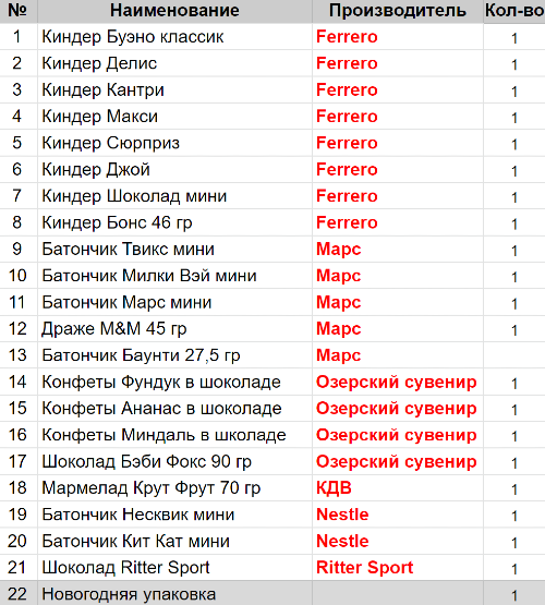 Вес: 709 гр.Состав: Буэно классик 1 шт, Делис 1 шт, Кантри 1 шт, Макси 1 шт, Сюрприз 1 шт, Джой 1 шт, Шоколад мини 1 шт, Бонс 46 гр 1 шт, Твикс мини 1 шт, Милки Вэй мини 1 шт,, Фундук в шоколаде 1 шт, Ананас в шоколаде 1 шт, Миндаль в шоколаде 1 шт, Марс мини 1 шт, Мармелад Крут Фрут 70гр 1 шт, Несквик мини 1 шт, Беби Фокс 90гр 1 шт, Драже M&M 1 шт, Баунти мини 1 шт, Ritter Sport 1 шт, Кит-кат мини 1 шт